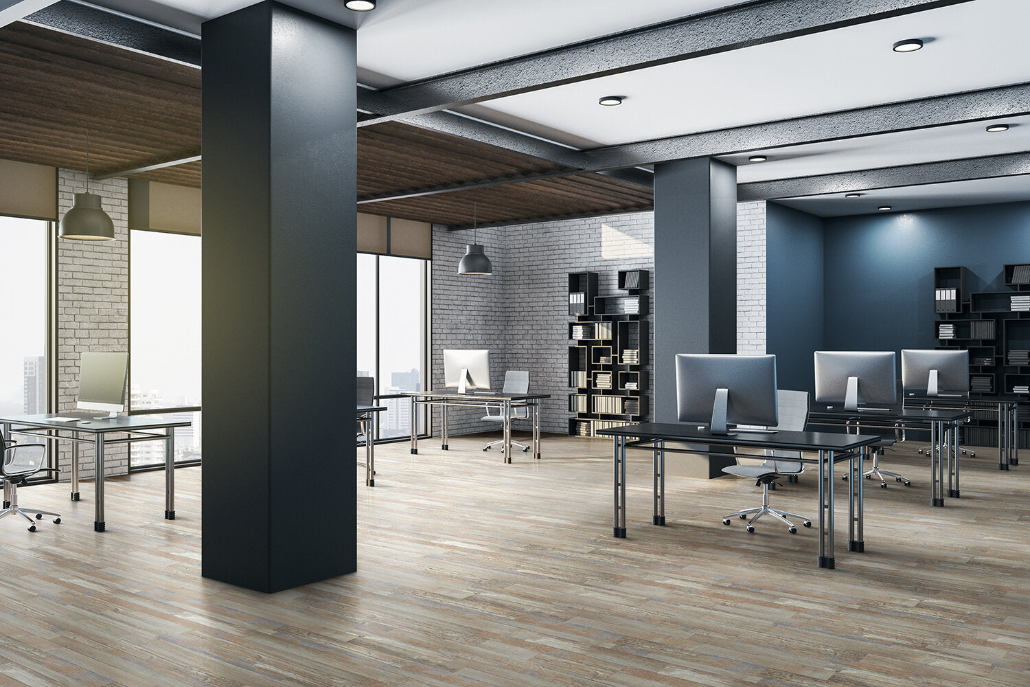 Pavimento heterogéneo con una amplia paleta de diseños de madera y hormigón que se adaptan a todas las aplicaciones comerciales: educación, vivienda, oficinas, cuidado de ancianos, hostelería.