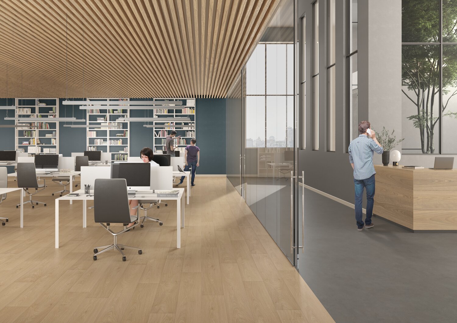Amplia paleta de diseños de madera y minerales que se adaptan a todas las aplicaciones comerciales: educación, vivienda, oficinas, cuidado de ancianos, hostelería.